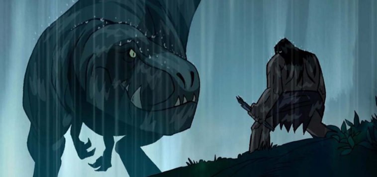 His hope filled eyes are slowly lowered signify his desire to avenge his family. He travels the thick green jungle in search of the dangerous beasts that took his family to find a green dinosaur mothering to you dinos that are quickly attacked by the bright beasts that lurk in the jungle looking for easy prey. The cave man sees this and having his family taken from him he jumps in and attacks the dino monsters in an attempt to protect the young family of hatchlings. Sadly the small newly hatched dinos are eaten and the green mothers pupils are quickly changed from wide ovals to sharp slants and primal instinct takes over and she acts quickly attacking the beast that ate her children with the assistance of the caveman and manage to kill the monstrous beast. The two look at each other locking eyes share a common grief of a family lost. The caveman walks away from the mother to give her time to process the tragedy that she as just faced. He walks to the ocean and travel alongside the beach turns around and sees that the mother dinosaure has chosen to follow him he turns around with his back facing the camera at a low angle revealing a landscape covered by the sun embrace to tell his newly accompanying partner that they are going on a great journey. The first episode telles a tragic story that we have seen several times but this unique way off having to protagonist that are natural enemy communicate without actually speaking is entertaining and interesting and I hope that it will continue this story with the two traveling along side facing more dangerous challenges and overcoming them together.